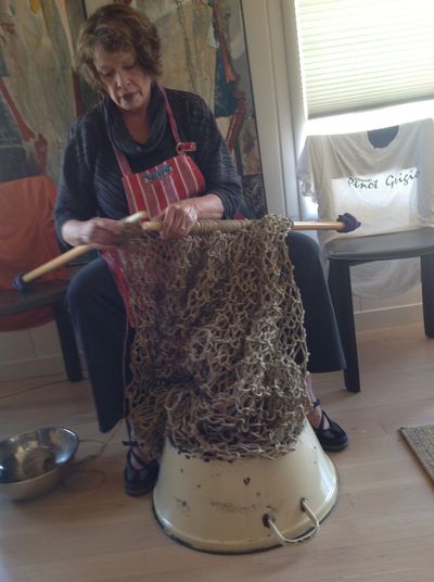 I wanted to re-create the ambiance of one of those ghost boats, with sails flapping and fishing lures cast on currents. But I wanted the viewers to construct their own narrative, so there couldn’t be too many clues. The eight turning panels have a quote written in kozo fibers, in French, by T. S. Eliot. I knit the net on broomstick handles.